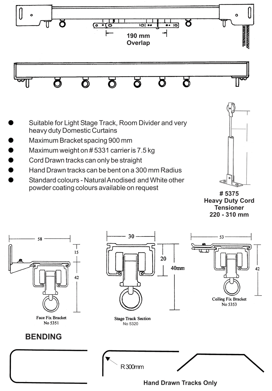 Oslo Series 53 is an extruded aluminium track section that can be bent on a radius of 350mm as a hand drawn track only. Corded tracks can only be in straight sections. Smooth operating two wheeled runners each have a working load of 7.5kg, allowing easy operation of both bent and straight tracks.